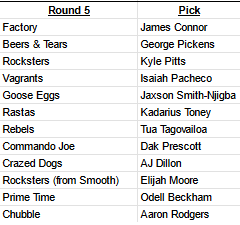 BF: KO, mocking the Rastas, does his own WOOOO strut as well before proclaiming to his unimpressed league mates that he is drafting Elijah Mitchell but mistakenly puts up Elijah Moore instead